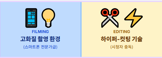 본격적인 쇼츠 제작 과정입니다. 스마트폰만 있어도 전문가처럼 보이는 **고화질 촬영 환경 구축**과, 시청자를 중독시키는 **하이퍼-컷팅 편집 기술**이 성공을 좌우합니다. 이 단계는 중요도가 높아 두 개의 심화 글로 나뉘어 있습니다.