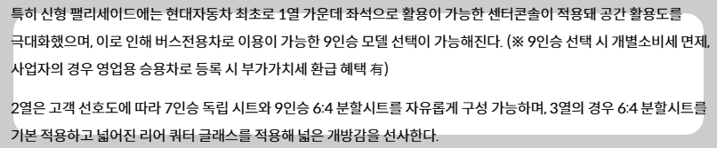 - 외장 색상 선택: 디 올 뉴 팰리세이드는 기존 색상에 더해 네 가지의 신규 색상을 추가하여 소비자들에게 다양한 선택의 폭을 제공합니다.