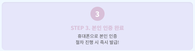 - **STEP 3. 본인 인증 완료:** 안내에 따라 본인 명의 휴대폰으로 **본인 인증 절차**를 진행하면 즉시 발급 완료됩니다.