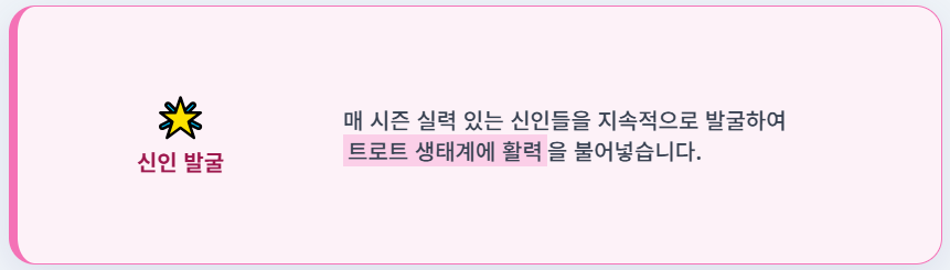 - 신인 발굴 시스템: 매 시즌 실력 있는 신인들을 지속적으로 발굴하여 트로트 생태계에 활력 불어넣기.
