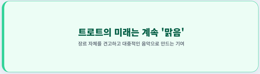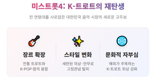 - 장르의 확장: 전통 트로트와 K-POP, 팝 등 다양한 장르의 융합 시도.