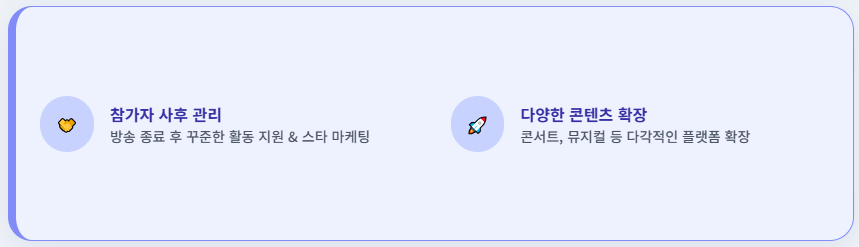 - 참가자 사후 관리: 방송 종료 후에도 꾸준한 활동 지원과 스타 마케팅.