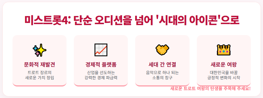 지금까지 '미스트롯4'가 우리 사회에 미치는 문화, 경제, 사회적 영향에 대해 깊이 있게 분석해 보았습니다. 이 프로그램은 단순한 엔터테인먼트를 넘어, 트로트라는 음악 장르의 가치를 재발견하고, 세대와 세대를 이어주는 중요한 문화적, 경제적 플랫폼으로 진화하고 있습니다.