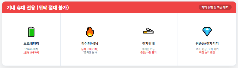 | 보조배터리 | 위탁 절대 불가. 1인당 5개(100Wh 이하)까지 휴대 가능 |