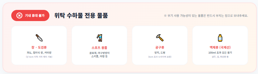 - 창·도검류: 과도, 접이식 칼, 커터칼 등 (날 길이 6cm 이하 가위는 예외적 가능)