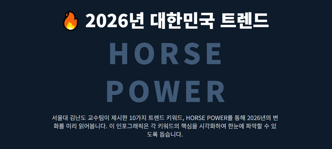 김난도 교수(서울대 소비자학과)팀은 **HORSE POWER**라는 강력한 키워드를 통해 2026년 한 해의 사회적, 경제적 변화를 예측합니다. 이 10가지 트렌드를 통해 다가올 미래를 성공적으로 준비하시길 바랍니다.