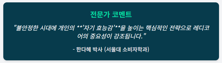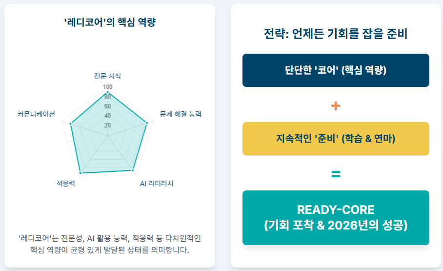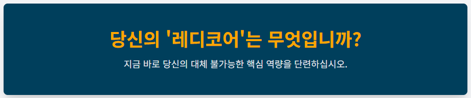 👉 레디코어 시대는 '준비된 자'만이 살아남는 것이 아니라, 준비할 수 있도록 스스로를 관리하는 **'자기 경영 능력'**이 핵심 경쟁력이 되는 시대입니다.