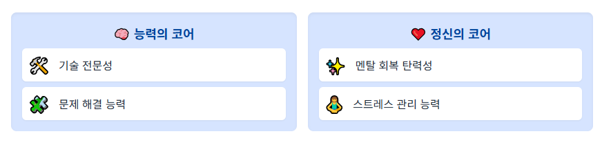레디코어는 두 가지 측면에서 나타납니다. **기술적 전문성, 문제 해결 능력** 같은 '능력의 코어'와 함께, **멘탈 회복 탄력성, 스트레스 관리 능력** 같은 '정신의 코어'를 동시에 강화하는 데 집중합니다.