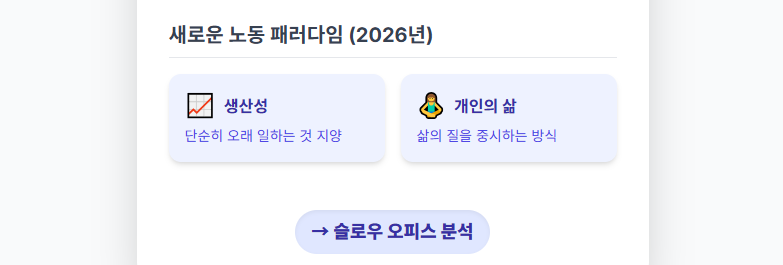 2026년 기업들은 단순히 오래 일하는 것이 아닌, **'느리지만 의미 있는 성과'**를 내는 방식을 추구합니다.