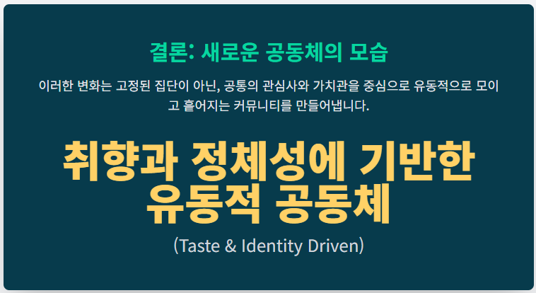 업무 환경의 변화를 다룬 슬로우 오피스에 이어, 다음 키워드는 고정된 세대 개념을 넘어 **개인의 취향과 정체성**에 따라 그룹이 형성되는 트렌드를 다룹니다. 다음 글에서는 **'취향 공동체(Taste Community)'**를 분석합니다.