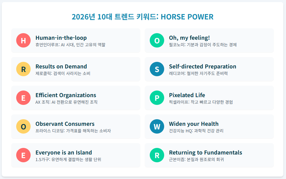 《트렌드 코리아 2026》 10가지 키워드 전체 내용은 ✅《트렌드 코리아 2026》 10가지 핵심 키워드 완벽 정리! (HORSE POWER 목차) 글에서 자세히 확인하실 수 있습니다.