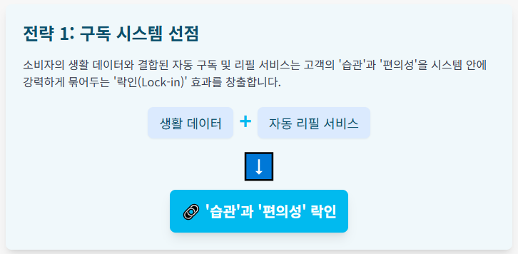 주요 생필품이나 반복 구매 품목에 대해 소비자의 생활 데이터와 결합한 **자동 구독 및 리필 서비스**를 구축해야 합니다. 소비자의 '습관'과 '편의성'을 시스템 안에 묶어두는 것이 핵심입니다.
