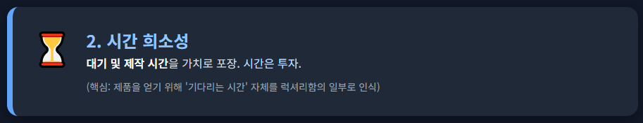 제품을 얻기 위해 **기다리는 시간(대기)**, 혹은 **제작에 들어가는 긴 시간**을 럭셔리함의 일부로 포장합니다. 시간 자체가 투자이자 가치가 됩니다.