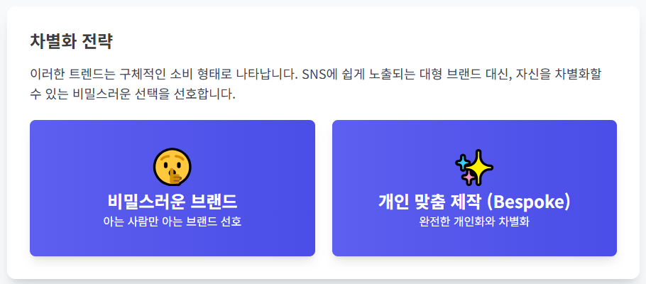 SNS에 쉽게 노출되는 대형 브랜드 대신, 아는 사람만 아는 **비밀스러운 브랜드**나 **개인 맞춤 제작(Bespoke)** 제품을 선호하며, 이를 통해 차별화된 만족감을 얻습니다.