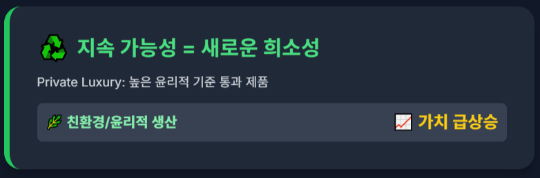 **친환경적이거나 윤리적인 방식으로 소량 생산된 제품**은 높은 윤리적 기준을 통과했다는 점에서 새로운 형태의 희소성(Private Luxury)으로 인정받으며 가치가 급상승합니다.