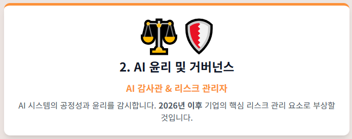 AI 시스템의 공정성을 감시하고 윤리적 문제를 방지하는 **AI 감사관(Auditor), 리스크 관리자** 등 새로운 형태의 직업이 필수적으로 부상할 것입니다. 이는 **2026년** 이후 기업 경영에서 가장 중요한 리스크 관리 요소가 될 것입니다.