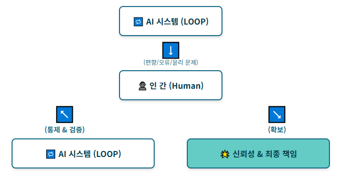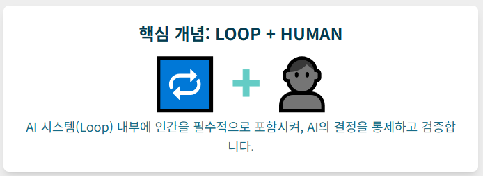 '루프(Loop)'는 AI가 데이터를 처리하고 의사결정을 내리는 전체 시스템을 뜻합니다. 인간(Human)이 이 루프 안에 반드시 포함되어야 한다는 것은, AI의 무오류성을 맹신하지 않고 인간의 통제권을 확보하려는 움직임입니다.