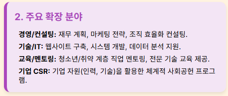 - 기술/IT: 사회적 기업의 웹사이트 구축, 시스템 개발, 데이터 분석 지원.