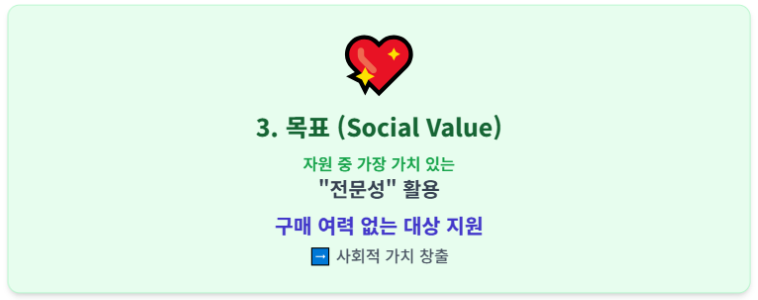 프로보노는 본인이 가진 자원 중 가장 가치 있는 자원인 전문성을 활용하여, 그 전문성을 구매할 여력이 없는 대상에게 사회적 가치를 창출하는 데 핵심 목표를 둡니다.