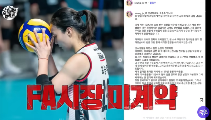 2024년 시즌 종료 후, 표승주는 네 번째 FA 자격을 획득했으나, 원소속팀(정관장)과의 협상 결렬과 다른 구단의 오퍼 부재로 인해 충격적인 은퇴를 선언했습니다. 이는 실력과 기량이 충분함에도 불구하고 베테랑 선수로서의 가치를 인정받지 못한 V-리그 현실을 단적으로 보여주었습니다.