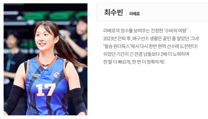 MBC '신인감독 김연경'의 필승 원더독스에 드라마틱한 복귀를 알린 원더독스멤버 최수빈 선수. 그는 2023년 아쉬운 은퇴를 선언하며 코트를 떠났지만, 배구를 향한 뜨거운 열정만은 결코 식지 않았던 올라운드 플레이어입니다. V-리그에서 공격과 수비 모두 능숙하게 소화하며 팀에 기여해 온 베테랑으로서, 그의 합류는 필승 원더독스에 큰 힘이 될 것입니다.