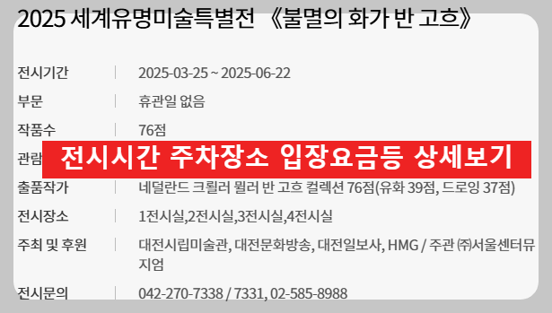 카테고리 없음 2025 세계유명미술특별전 《불멸의 화가 반 고흐》 by hjinfo 2025. 3. 23. 반응형 2025반 고흐세계유명미술특별전이 대전 시립미술관에서 3/25일부터 6/22일까지 열립니다. 찾아가는 길 전시회 상세정보 출처:대전시립미술관 관람료 특별할인받기 출처:대전시립미술관 관람료출처:대전시립미술관 반응형 공유하기 게시글 관리 정보종합 저작자표시 비영리 변경금지 (새창열림)