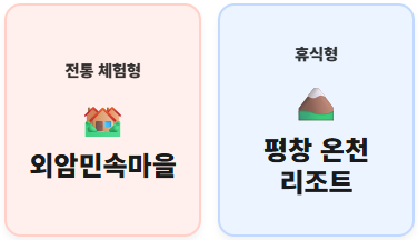 - 휴식형: 평창 온천 리조트, 아산 온양온천