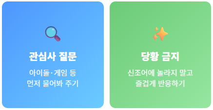 • 핵심 전략: 아이들의 유행어에 당황하지 말고, 그들의 관심사(아이돌, 게임 등)를 먼저 물어봐 주세요.