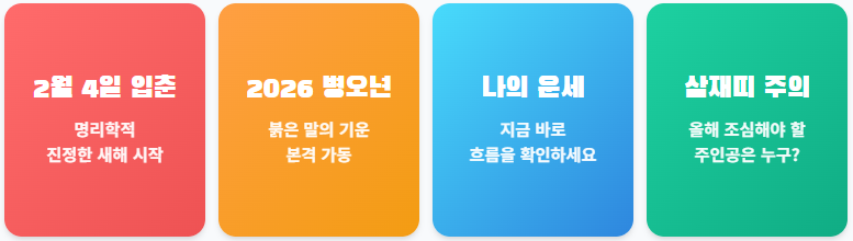 명리학에서는 '입춘'을 진정한 새해의 시작으로 봅니다. 즉, 오늘(2월 4일) 시각 이후부터 비로소 2026년 병오년(丙午年)의 기운이 본격적으로 시작되는 것이죠. 올해 나의 운세는 어떨지, 특히 주의해야 할 '삼재띠'는 누구인지 지금 바로 확인해 보세요.