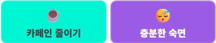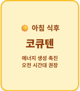 - 아침 식후: 코큐텐 (에너지를 생성하므로 오전에 좋습니다.)