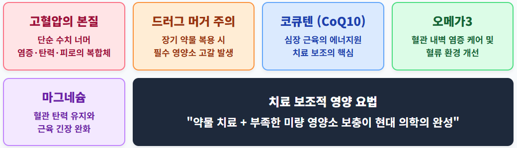 특히 장기적인 혈압약 복용은 체내의 특정 영양소를 고갈시키는 '드러그 머거(Drug Mugger)' 현상을 일으키기도 합니다. 오늘 이 글에서는 3,500자의 심층 분석을 통해 고혈압 관리의 3대 핵심 성분인 코큐텐, 오메가3, 마그네슘의 과학적 근거와 주의사항을 완벽하게 정리해 드립니다.