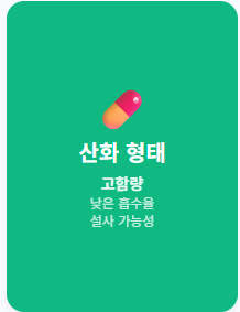 - 산화마그네슘: 함량은 높지만 흡수율이 낮고 설사 유발 가능성이 있습니다.