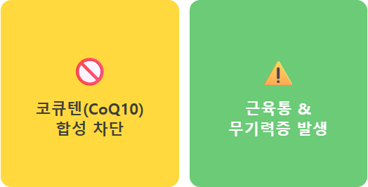 만약 고지혈증 치료제인 '스타틴' 계열의 약을 복용 중이라면, 약 성분이 코큐텐의 합성을 차단합니다. 이로 인해 근육통이나 무기력증이 생길 수 있으므로, 스타틴 복용자는 반드시 코큐텐 보충이 권장됩니다.
