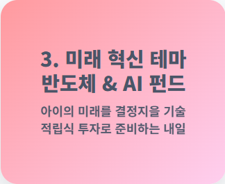 3. 미래 혁신 테마: 반도체 및 AI 펀드아이가 어른이 되었을 때 세상의 중심이 될 기술에 미리 투자하는 것입니다. 적립식 펀드를 활용해 매달 일정 금액을 불려 나가는 것을 추천합니다.