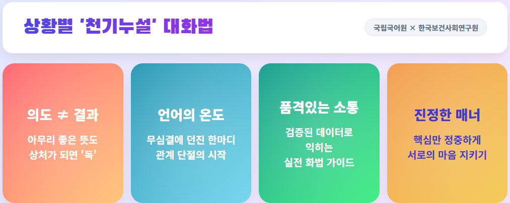 명절 대화에서 가장 조심해야 할 부분은 의도와 상관없이 상처를 주는 말들입니다. 국립국어원과 한국보건사회연구원의 데이터를 바탕으로 구성한 실전 대화 가이드를 통해 세련된 화법을 익혀보세요.
