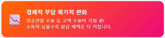 - ✅ 기대 효과: 수술비가 많이 나오는 인공관절 수술의 경우, 소득 분위가 낮을수록 돌려받는 금액이 커져 경제적 부담이 획기적으로 줄어듭니다.