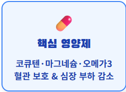 - 🥗 07. 핵심 영양제 보충: 코큐텐, 마그네슘, 오메가3는 혈관 내벽을 보호하고 심장의 부하를 줄여줍니다.