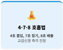 - 🧘 12. 4-7-8 호흡법: 4초 들이마시고 7초 참고 8초 내뱉는 호흡은 교감신경을 즉각 진정시킵니다.