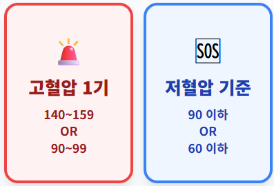- 🚨 고혈압 1기: 수축기 140~159 OR 이완기 90~99