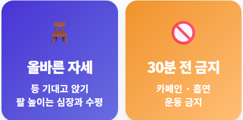 - 금기 사항: 측정 전 30분 이내에는 카페인 섭취, 흡연, 운동을 피하세요.