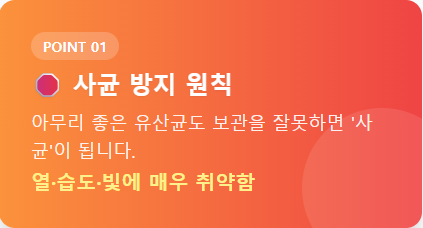 아무리 좋은 유산균도 보관을 잘못하면 '사균'을 먹는 꼴이 됩니다. 유산균은 열, 습도, 빛에 매우 취약합니다.