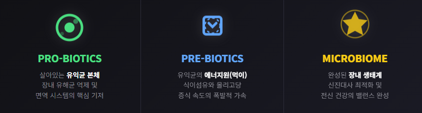 | 역할 | 유해균 억제 및 점막 보호 | 유익균의 증식 및 활성화 도움 |